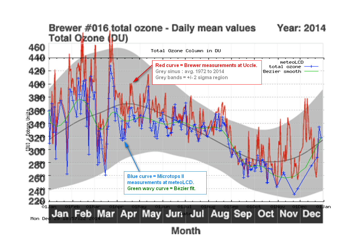 previous years. 2. Overplot of 2014 Uccle and meteoLCD total ozone measurements (new!) 3. 3D plot of total ozone column for latitude region [45 to 50] from 1964 to 2007 and maps of all of meteoLCD measurements (from WOUDC) 4. Older dobson files are in the data archive |