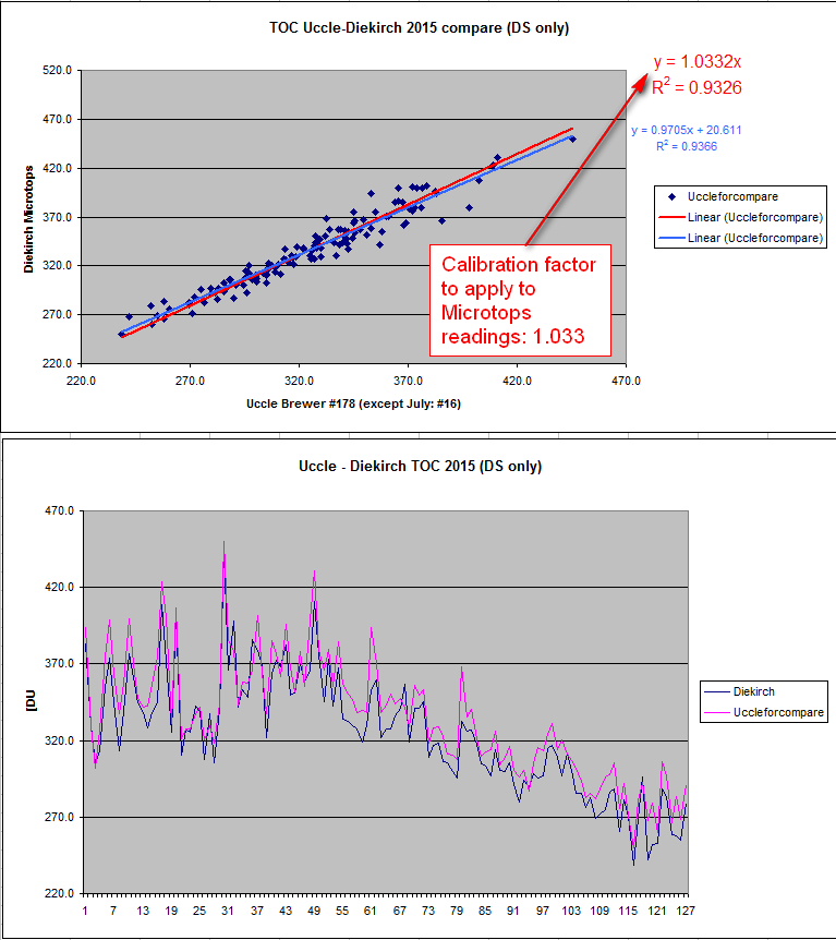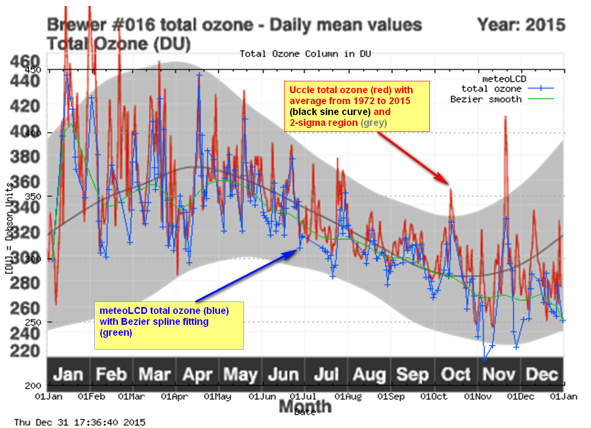 previous years. 2. Overplot of 2015 Uccle and meteoLCD total ozone measurements; graph of 127 days common measurements (Uccle: Brewer #178) 3. 3D plot of total ozone column for latitude region [45 to 50] from 1964 to 2007 and maps of all of meteoLCD measurements (from WOUDC) 4. Older dobson files are in the data archive |