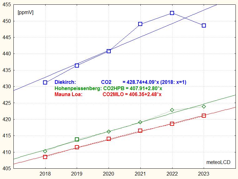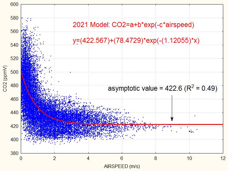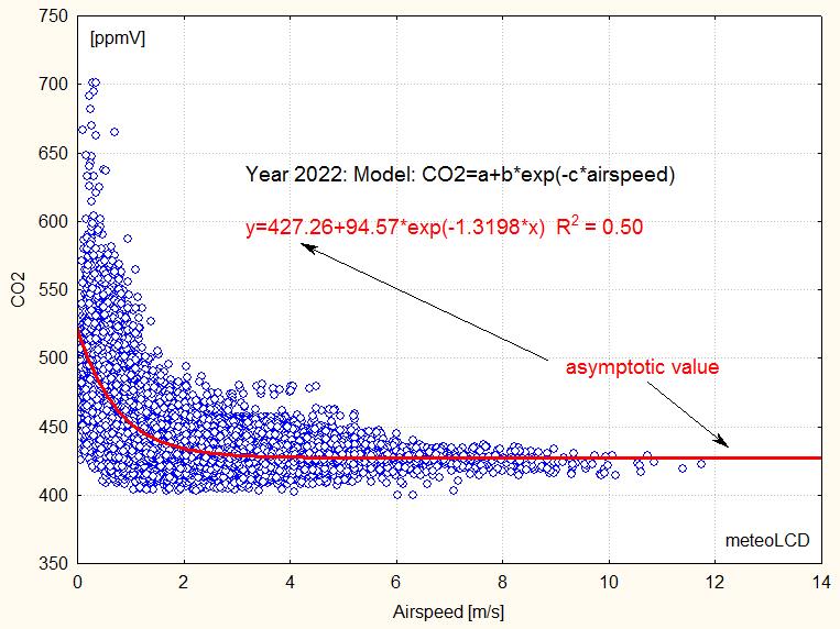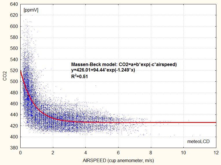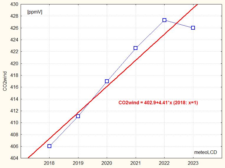Asymptotic CO2 mixing ratio (Massen-Beck model) Addendum 3 describes our model to calculate an asymptotic CO2 mixing ratio (airspeed by cup anemometer). The plot shows how these values vary since 2018 (Vaisala sensor), suggesting a yearly increase of 4.4 ppmV since 2018 (practically the same as given by the normal readings ).