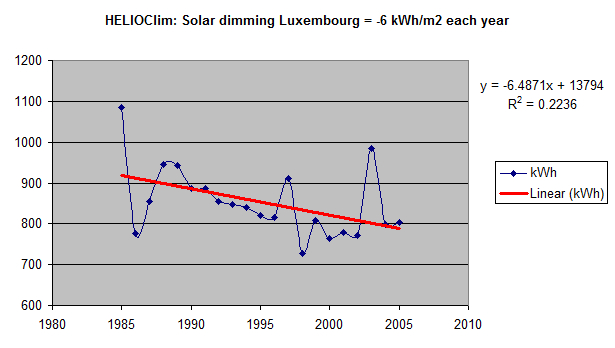 A change in solar irradiance of -0.82 kWh*m-2y-1 (decade 2005 to