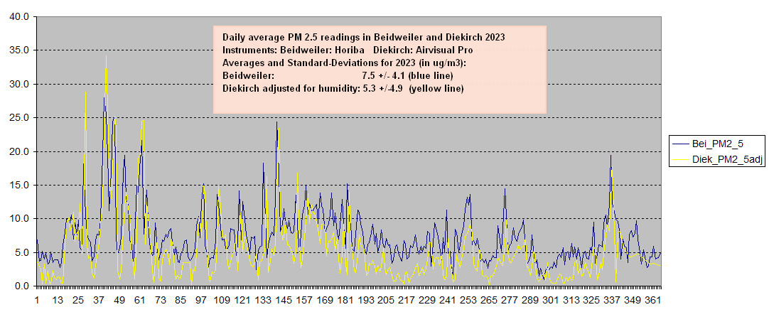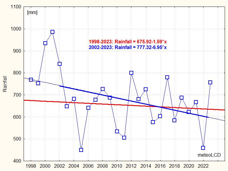 Values of rainfall (precipitation) of the year 2023: Diekirch: 755.8 mm Findel: 887.0 mm Diekirch & Findel mean +/-stdev: