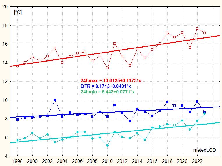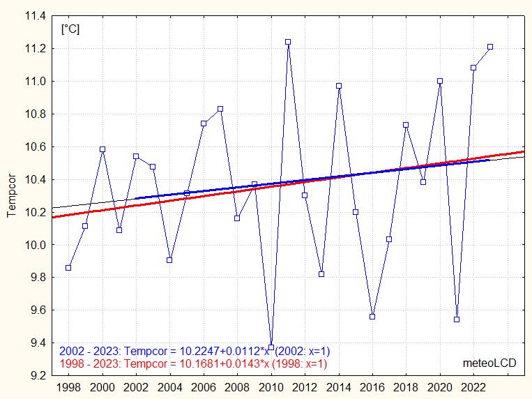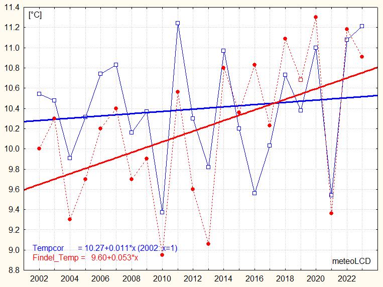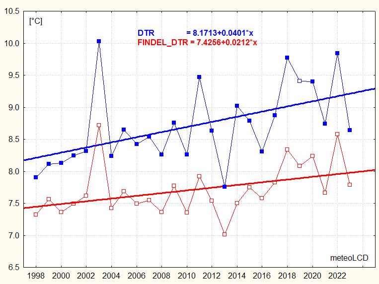 = -0.25*0.09 = -0.02 K (or °C).per year. The meteoLCD measurements