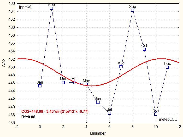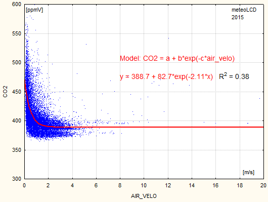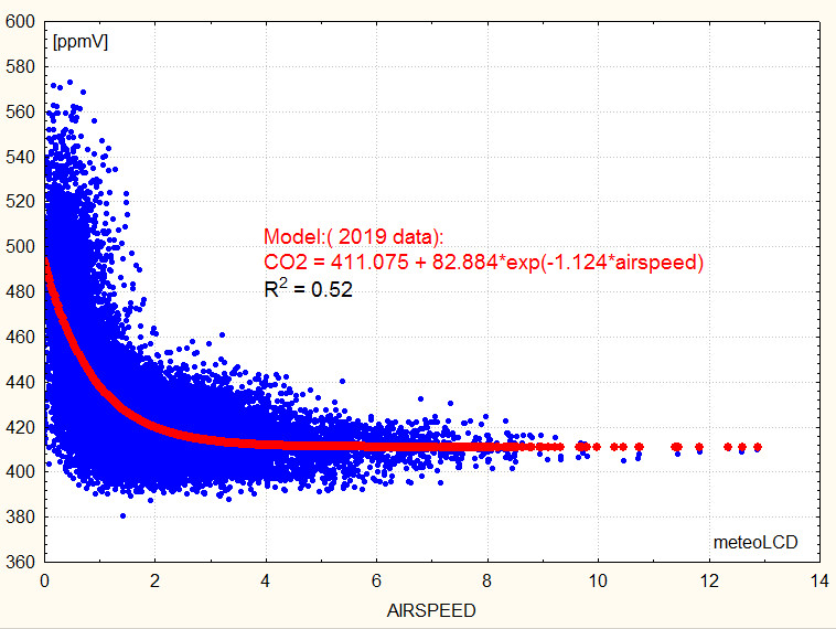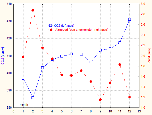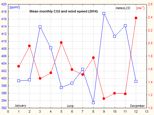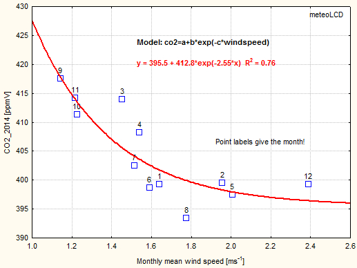 analysis of the seasonal CO2 pattern in 2014. The mean monthly CO2 data show an oscillatory pattern which can be modeled by a 6 month period sine wave. This is not consistent with the commonly admitted explication that the summer lows and winter highs are a fingerprint of changing photosynthesis, which should lead to a single annual sinus wave (as in 2013). The 6 month period is essentially caused by the low Jan, Feb and Dec values, and is replaced by the usual 12 period if these months are omitted. The right figure shows the monthly mean CO2 and monthly mean wind speeds. Clearly low wind goes with high CO2, independent of the seasons (significant correlation R = -0.86 !) The next figure gives the CO2 mixing ratios versus the monthly mean wind speed; the usual exponential model beautifully describes this pattern. The horizontal asymptote of 395.5 ppmV should correspond to the background CO2 level, as shown in [21]. There is some debate about the (global) changes of the seasonal CO2 amplitude, which seems to increase due to global greening [41], agricultural green revolution [43], changing air trans-continental circulation [42] and possibly other unknown factors. Look also at the presentation [44]. Locally it seems that the effects of higher/lower wind speeds and photosynthesis are difficult to untangle. If we restrict our data to those days where the mean wind speed is less than 1, the correlation between CO2 and wind speed is lower (-0.76) but still significant. Curiously all the papers studying this seasonal amplitude problem seem to ignore the influence of changing wind speeds.