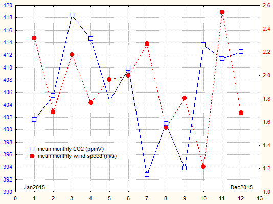 analysis for 2015 Here again higher wind speeds usually go together with lower CO2 levels (notice the exception on March!), but the monthly mean values do not follow the usual model well.