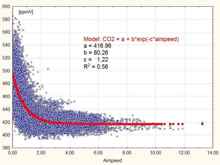 versus wind speed for 2017 (wind speed by cup anemometer): The Mauna Loa average CO2 mixing ratio for 2017 is 406.6, which would suggest that our asymptotic value of 392.3 is too low. If we use only the measurements by the new Vaisala GMP343 sensor, the asymptotic value becomes 395.7.