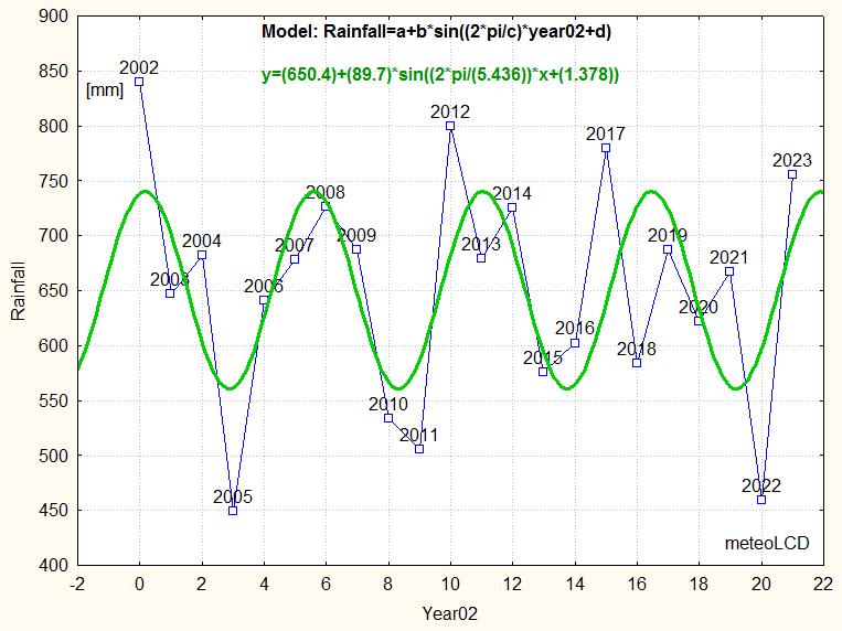 parameters are significant at the alpha = 0.95 level! The oscillatory rainfall pattern is a good example how foolish it is to apply linear regressions to data when these are harmonic, something the media, activist groups and many politicians often do without much thinking. |