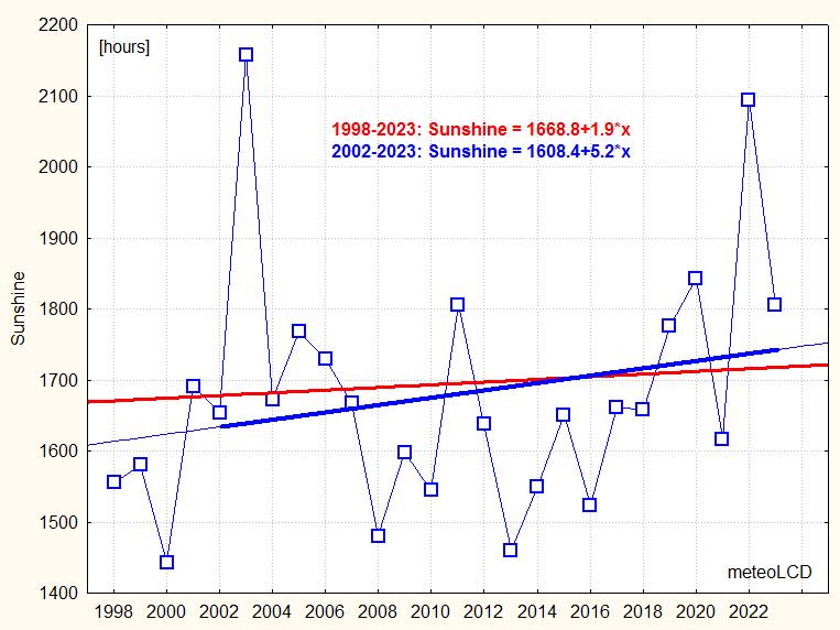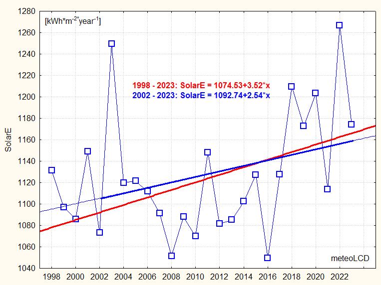 1998 - 2023 is positive, in concordance with solar irradiance and sunshine
