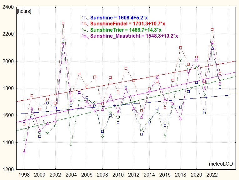 The 2nd graph shows the plots of the four above-mentioned stations. It should be noted that meteoLCD (Diekirch) is located in a valley, Trier and Findel & Maastricht airports on top of a plateau. The Findel totals are much higher than those of the other stations, which certainly is also partially caused by the use of the Campbell-Stokes instrument known to give too high readings. All 4 stations give totals that practically always vary in the same manner (synchronous increase and decrease). The trends of all 4 stations are positive since 1998 and similar, except Diekirch being lower All stations show distinct decline in sunshine hours in 2021, and a 2022 maximum close to that of 2003. These positive trends from 1998 on probably suffice to explain the warming since 1998. The correlations between mean temperature are yearly sunshine hours are positive for the 4 stations, and these correlations are statistically significant at the alpha = 0.95 level for all stations: Diekirch: 0.48, Findel 0.60, Trier 0.58, Maastricht 0.49 |
