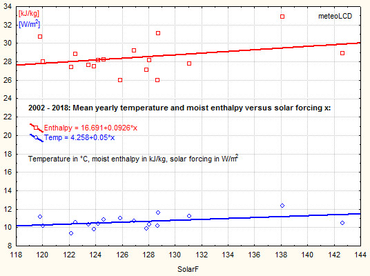 Both air temperature and moist enthalpy are positively correlated to changes in solar forcing ( = mean solar irradiance). The Pearson correlation between mean solar irradiance and moist enthalpy is 0.73 and is significant at the p = 0.05 level, whereas the correlation between mean solar irradiance and temperature is 0.42 (not significant). A change of 1 Wm-2 of mean solar irradiance would cause a (big!) average heating of 0.5 °C per decade and a change of 0.9 kJ/kg of moist enthalpy per decade. Possibly taking into account some lag (as for instance 4 months for temperature lagging solar forcing) would change these numbers. Our temperature measurements give a heating of 0.7°C/decade for the same period (Findel shows 0.5°/decade), which is close to the correlation given if the solar irradiance was the unique warming influence!