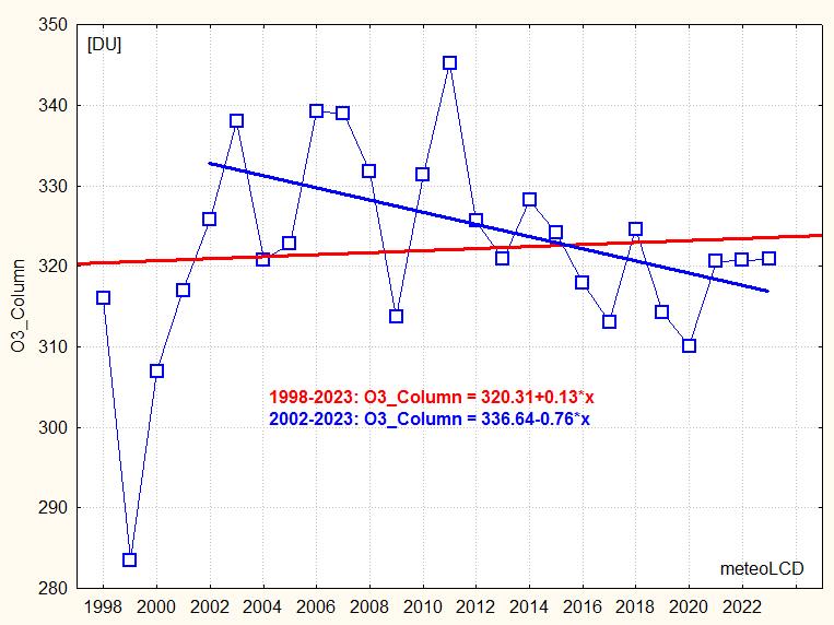 ("good ozone") Mean and stdev of the year 2023: 320.9 +/- 40.1 DU (169 days) minimum : 225.6 (13 Feb ) maximum: 465.2 (16 Jan)