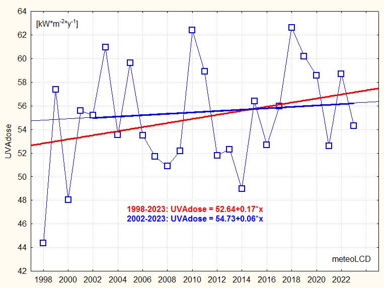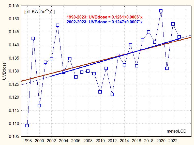 Erythemal UVB dose of the year 2023: 0.143 eff. kWh/m2 mean +/- stdev: 1998 to 2023: 0.134 +/- 0.010 eff. kWh*m-2y-1 2002 to 2023: 0.135 +/- 0.008 The trend over