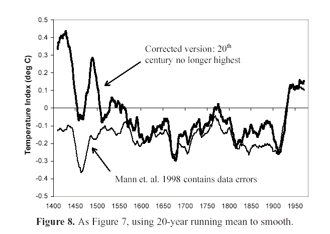 Now it seems that the graph is based on faulty and/or incomplete data; a recalculation using Mann's own methodology has been made by independent (not sponsored nor funded!) researchers Stephen McIntyre and Ross McKitrick (Corrections to the Mann et. al. (1998) Proxy Data Base and Northern Hemispheric Average Temperature Series, Energy & Environment, vol.14, number 6, 2003, ISSN 0958-305X; complete text as as pdf file here), . The results are staggering: if correct data are used, there is no hockey stick, no unprecedented warming during the late 20th century!