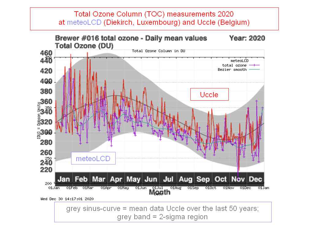 years. 2. New: Overplot of 2020 readings at Uccle and meteoLCD 3. 3D plot of total ozone column for latitude region [45 to 50] from 1964 to 2007 and maps of all of meteoLCD measurements (from WOUDC, many years missing!) 4. Older dobson files are in the data archive |