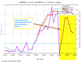 WBGT sensor restarted today at 09:00 UTC. Watch how the web bulb temperature changes as the humidified PT100 sensor inside the wick starts to loose heat by evaporation. | ||||||