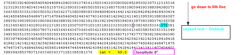 | 3. Find the data block corresponding to a latitude of 49.5 North (positive latitude): Diekirch is second last block at 6th line |