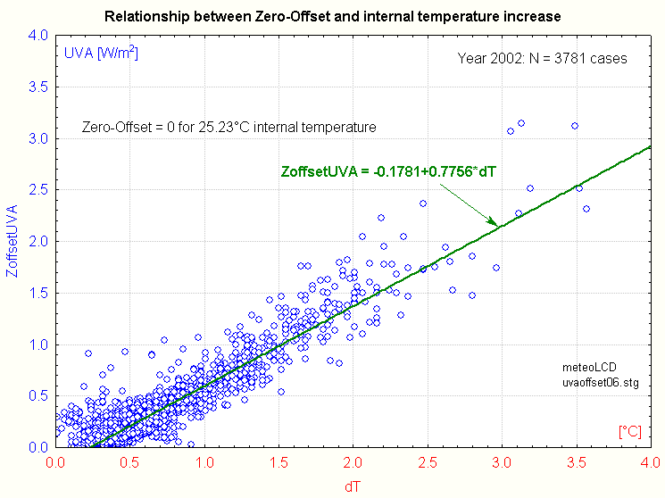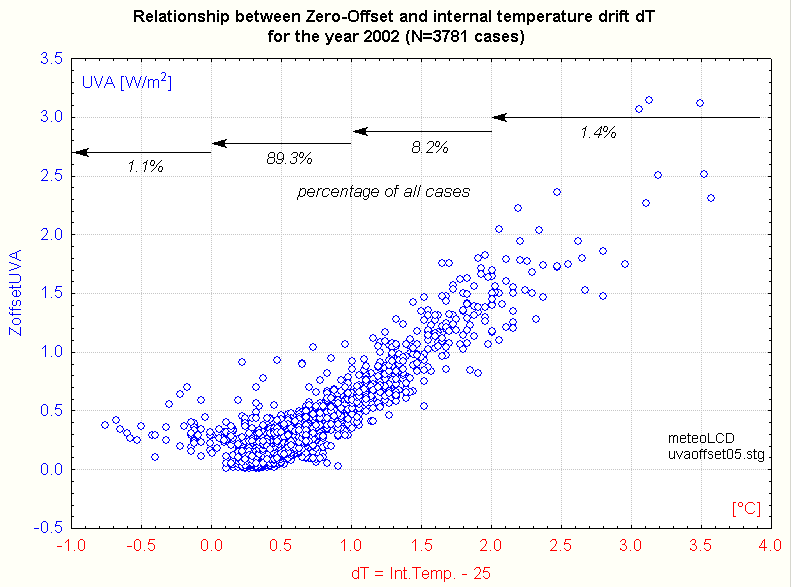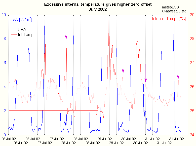 A UVA Biometer from Solar Light Co.(instrument # 2828, last calibrated Nov. 1999) showed relatively rare excessive zero-offsets during night-time. The occurances seemed more or less random, and not caused by external meteorological factors. Inspection showed that the unique probable cause is a malfunctioning thermal stabilization. The phosphor converting UVA to visible light is temperature sensitive, so a Peltier element stabilizes it at a nominally 25°C. A malfunctioning of this electronic element was practically always a drift to too high temperatures (e.g. 27 °C), even in very cold conditions; we rarely observed too low internal temperatures. To be able to apply eventual corrections, meteoLCD reads and stores both the UVA irradiance and the internal temperature of the instrument.