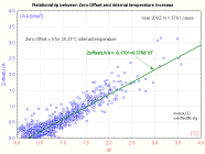 We will define "night-condition" the hours between 00:00 -> 02:30 up to 00:00 -> 06:30, according to the season. The following figure gives the relationship between zero-offset and dT for the whole year 2002 ( N = 3781 night-time cases). the vast majority lies in the internal temperature range [25 - 26°C]. For internal temperatures lower than 25°C, the zero-offset is a nearly constant 0.25 W/m2.